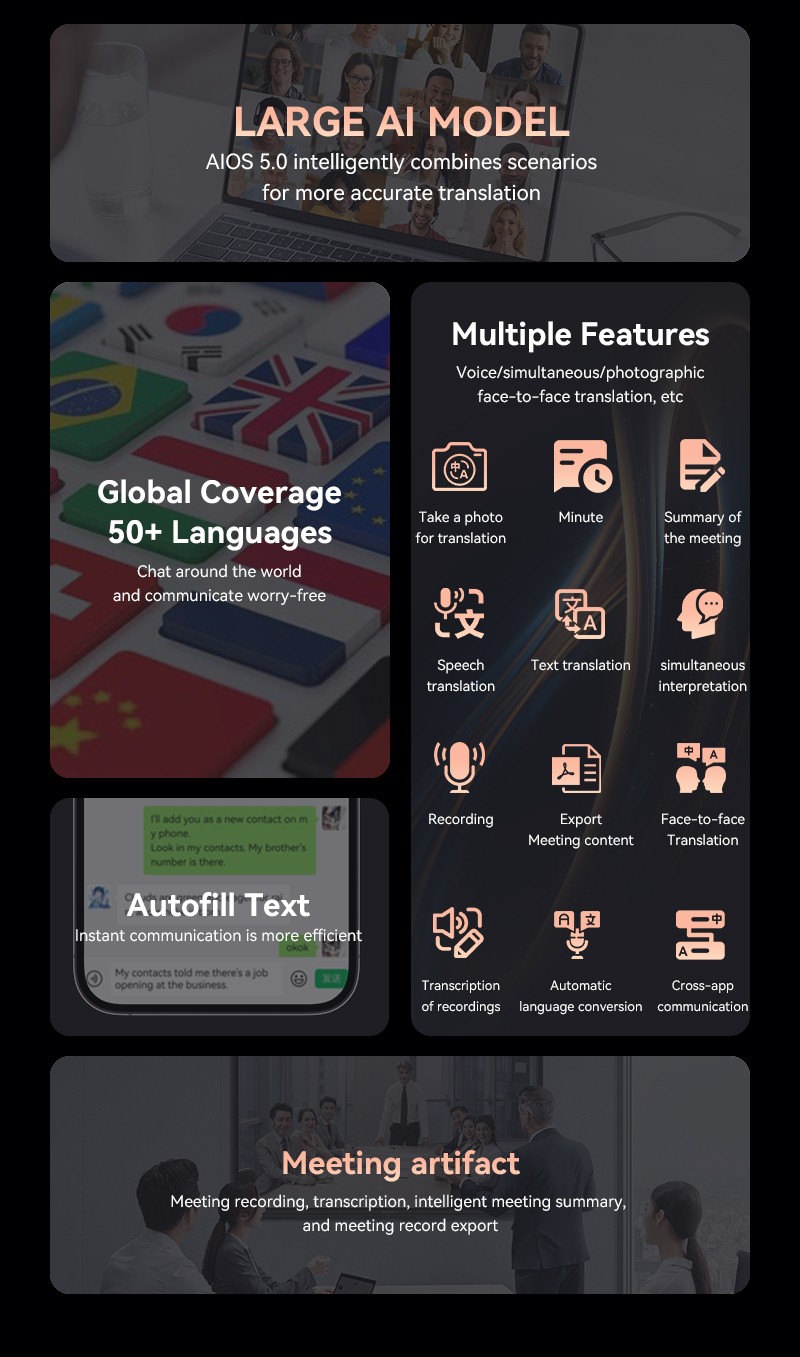 · AI Real-Time Translation: Supports photo translation, real-time call translation, real-time voice translation, face-to-face translation, simultaneous interpretation, text translation, and menu camera translation, enabling communication without boundaries.
