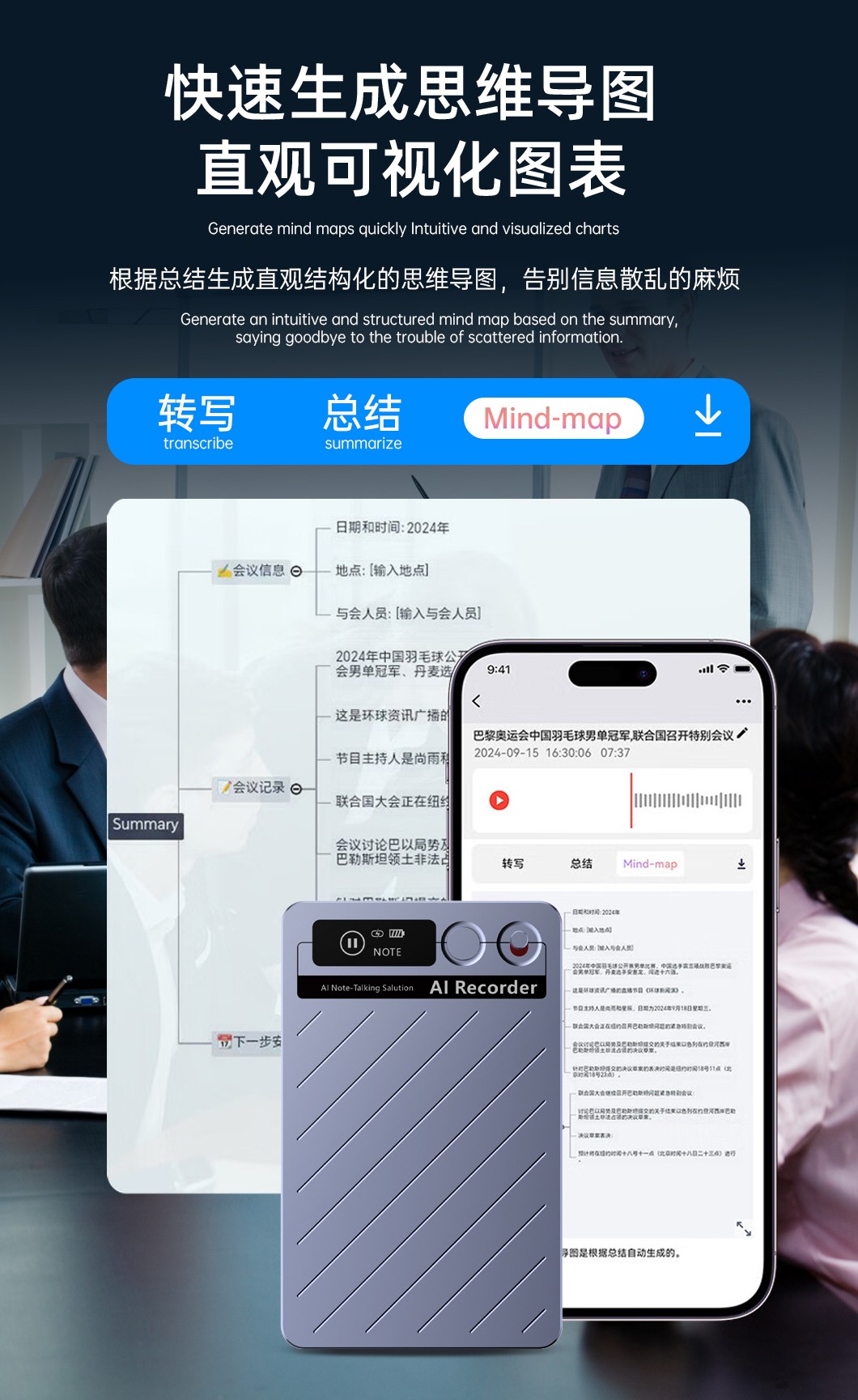 -Output Formats: Instant transcripts, meeting summaries, mind maps