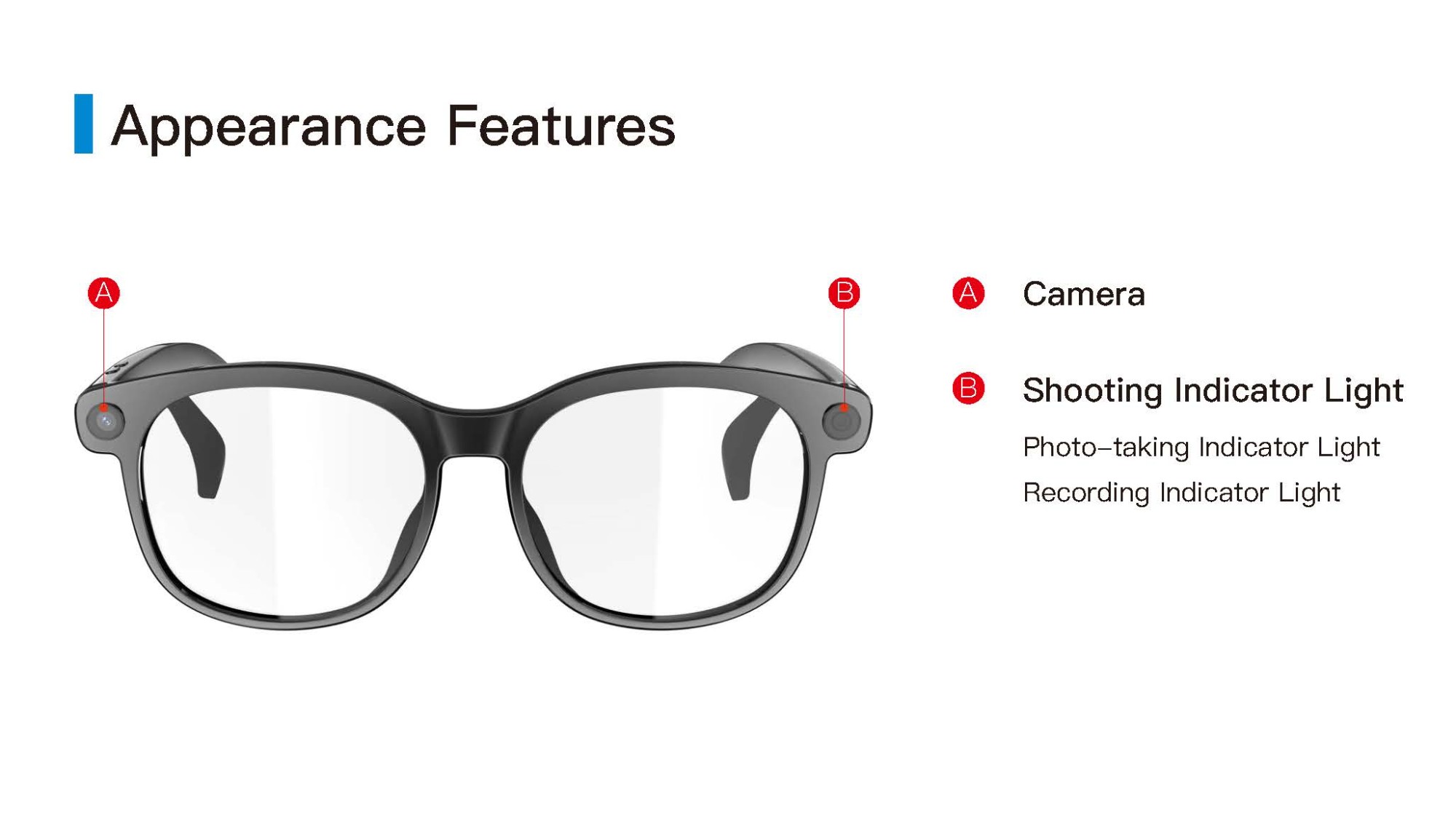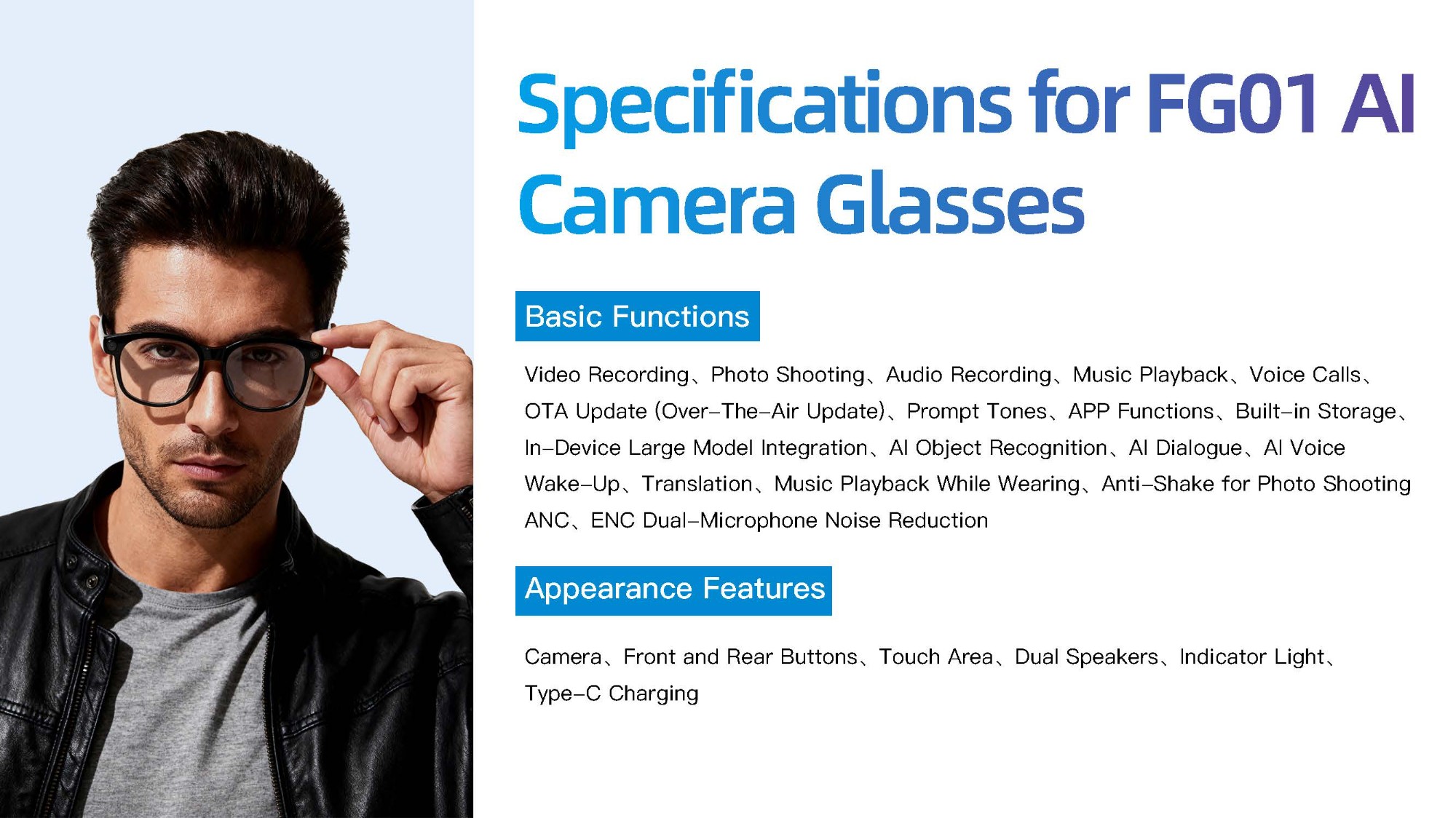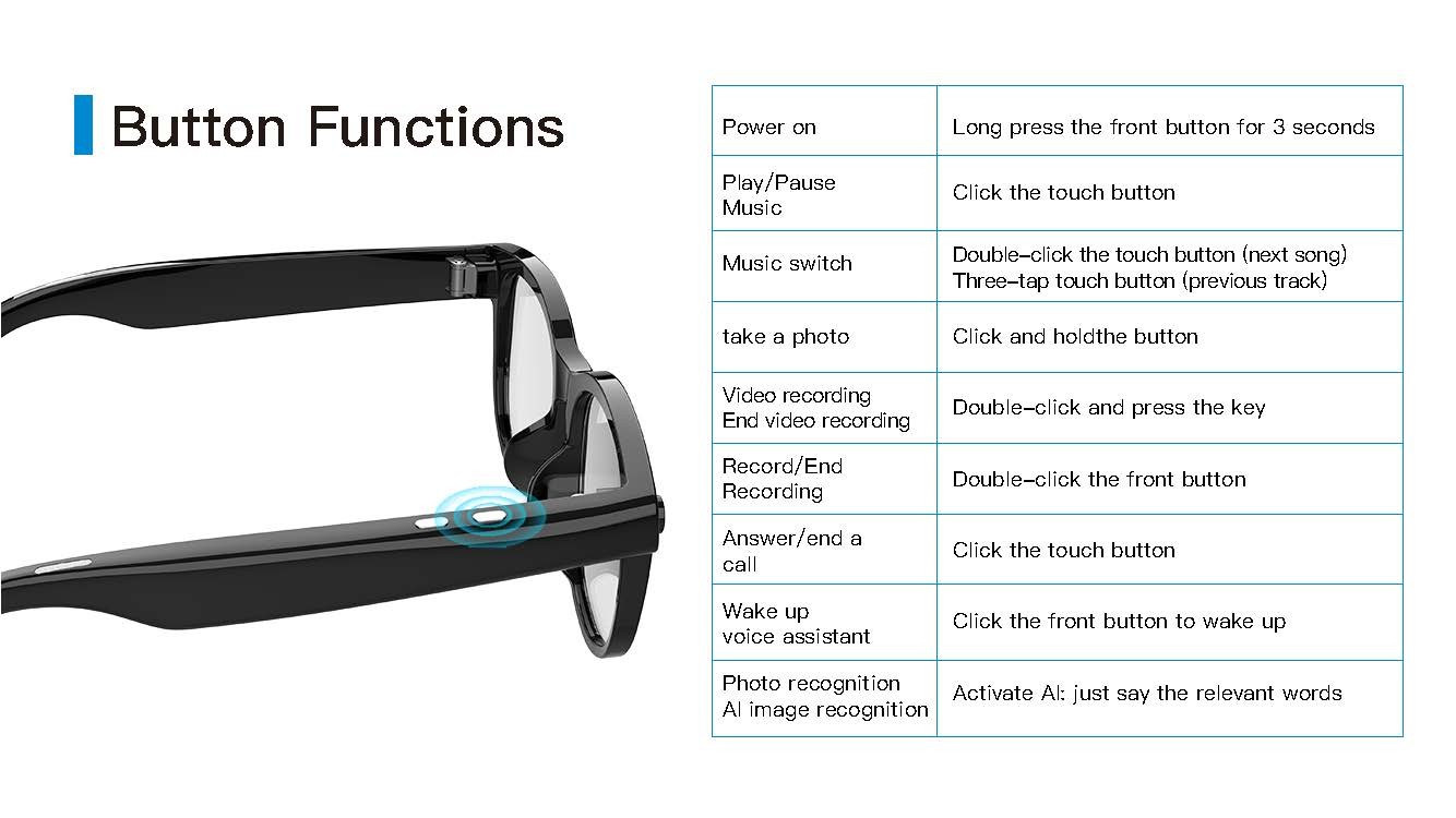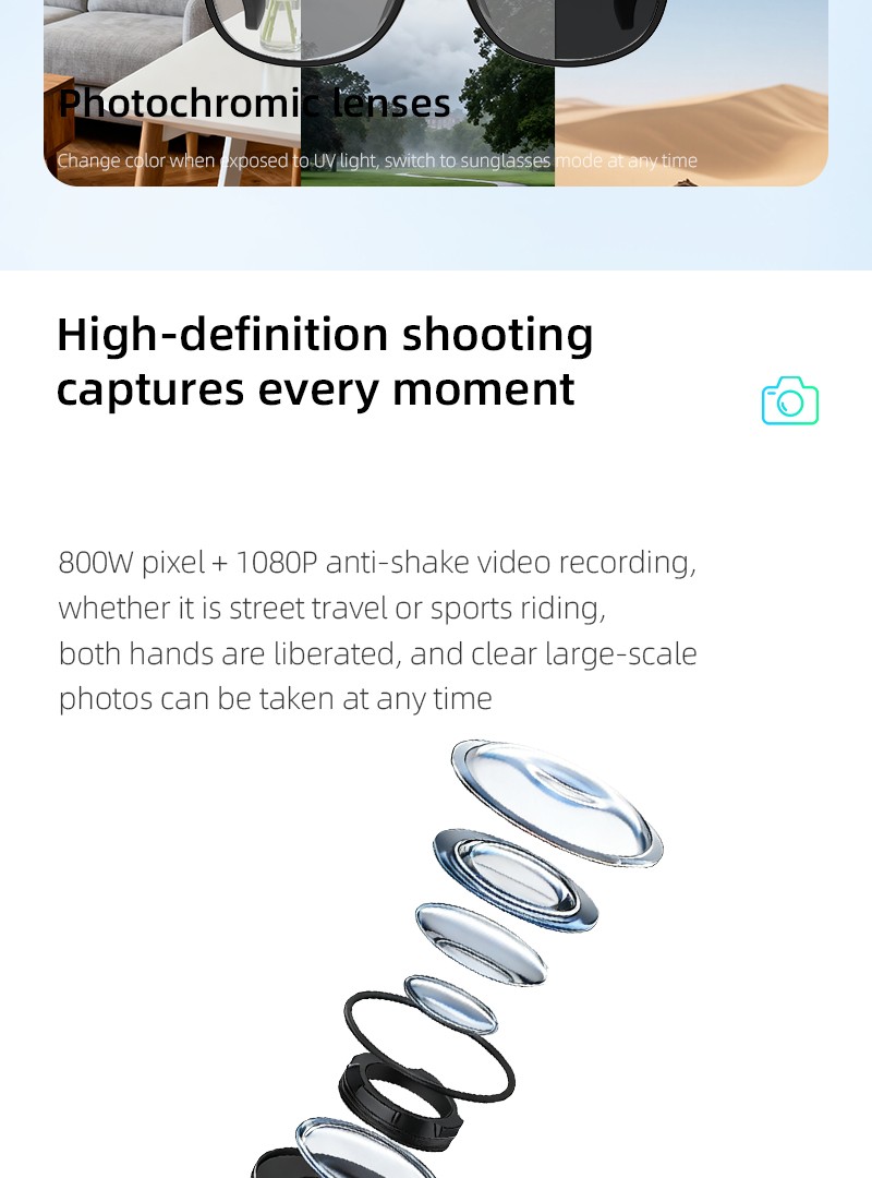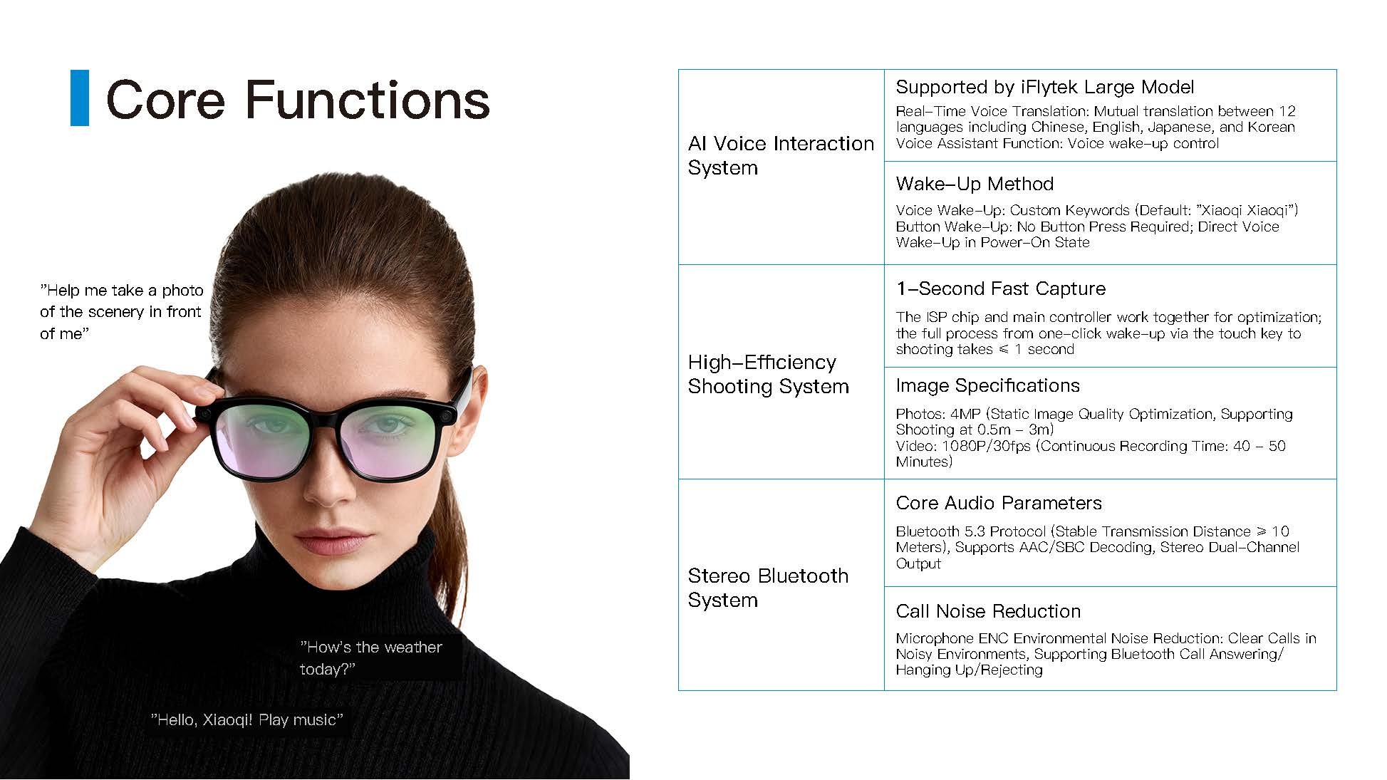 Video recording, photography, recording, music playback, voice calling, OTA upgrade, promptsound, APP function, built-in storage, built-in large model,