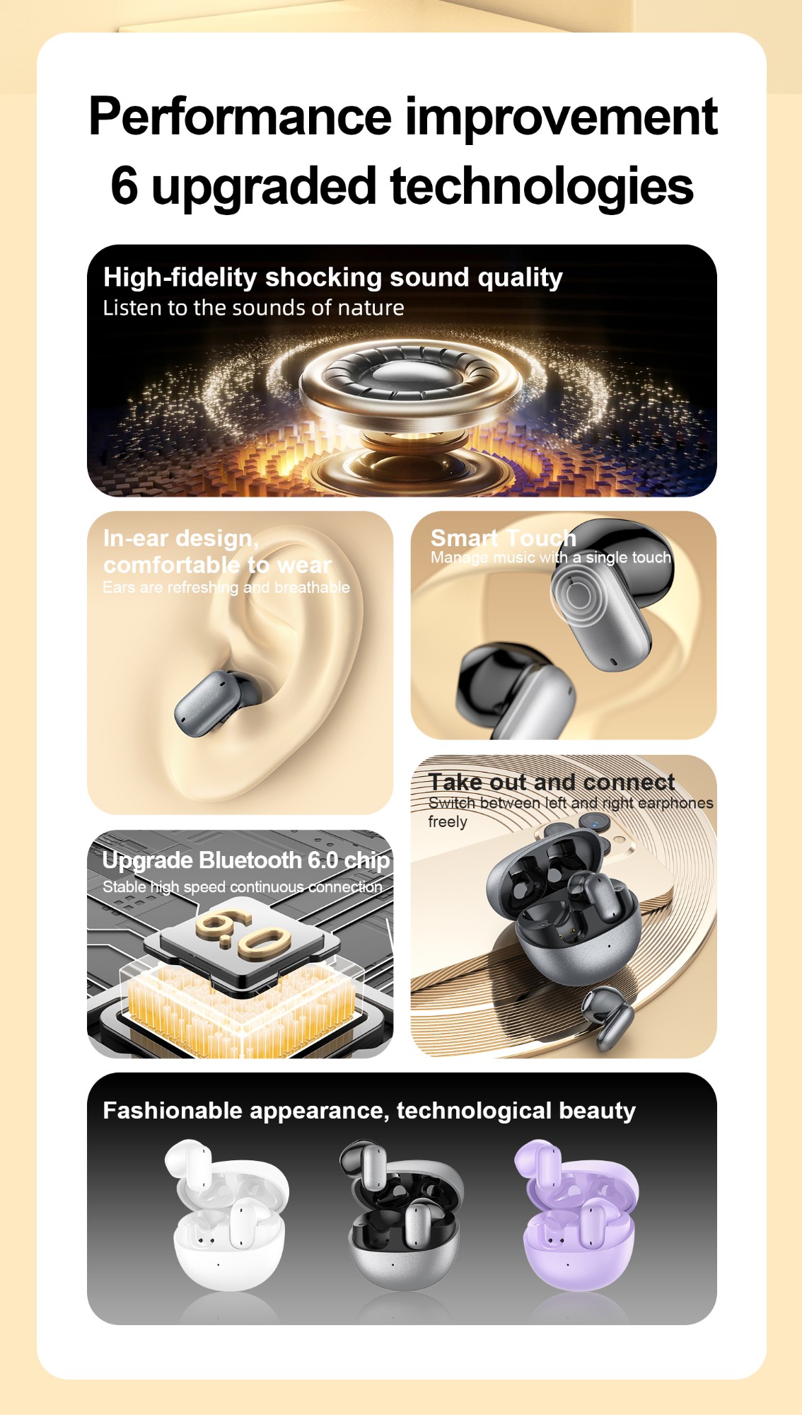 · Built-in high-sensitivity microphones and ambient noise reduction algorithms ensure clear voice pickup, even in noisy airports and streets, ensuring accurate translation. · HD Sound Quality: Utilizing high-quality drivers, the earbuds deliver an immersive music and call experience, perfect for both work and play.